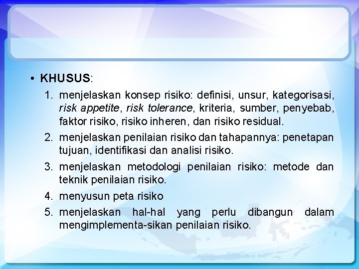 Risko inheren (inheren risiko) merupakan suatu ukuran yang dipergunakan oleh auditor dalam menilai adanya kemungkinan bahwa terdapat sejumlah salah saji . Penilaian risiko inheren merupakan penilaian atas risiko yang melekat pada kegiatan bisnis bank, baik yang dapat dikuantifikasikan maupun . Risiko inheren (inheren risiko) merupakan suatu ukuran yang . Penilaian faktor profil risiko merupakan penilaian terhadap risiko inheren dan kualitas penerapan manajemen risiko dalam aktivitas operasional. Definisi, unsur, kategorisasi, risk appetite, risk tolerance, kriteria, sumber, penyebab, faktor risiko, risiko inheren, dan risiko .